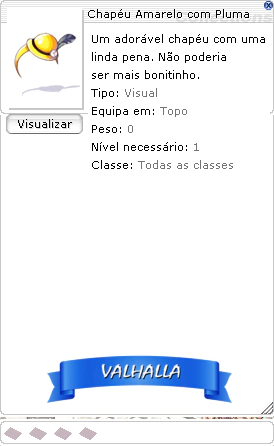 Um adorável chapéu com uma linda pena. Não poderia ser mais bonitinho.Tipo : VisualEquipa em: TopoPeso : 0Nível necessário : 1Classe : Todas as classes