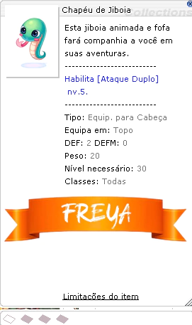 Quem anda por Prontera já viu um dos folhetins escritos pelo grupo de bardos comediantes infames. Adotando a jibóia como mascote, o grupo se tornou um sucesso nacional, motivando as Organizações Kafrajara a lançar esse chapéu. Diante da fama do novo chapéu, os comediantes comentaram: Só não usa a Jibóia quem for goiaba!.