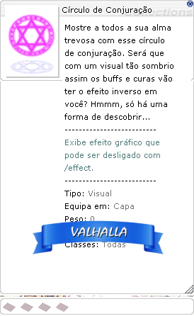 Mostre a todos a sua alma trevosa com esse círculo de conjuração. Será que com um visual tão sombrio assim os buffs e curas vão ter o efeito inverso em você? Hmmm, só há uma forma de descobrir...