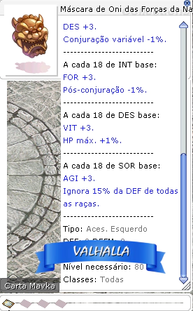 Uma máscara assombrosa de um demônio que se popularizou no folclore de Amatsu. Embora seja muito utilizada para conduzir rituais, usá-la em combate para assustar seus inimigos não é nenhum desrespeito à cultura do povo de Amatsu.