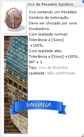 Ovo contendo um Pesadelo Sombrio de estimação. Deve ser chocado por uma Incubadora. Com lealdade normal: Tolerância a [Sono] +100%. Com lealdade alta: Tolerância a [Sono] +100%, INT + 1. Tipo: Ovo de Bichinho